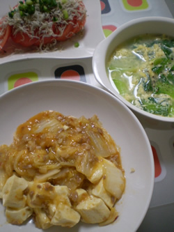 どうも自分で買い物をすると貧乏性が働いてえびとかあさり、牛肉は買わないし、![]() 自分が好きじゃない肉系も買わないでしょう。 旦那はいつも外で食べすぎるせいで、 家では納豆と魚と味噌汁があるだけのシンプルな食事を望むし ちょうどいいかも。 で、、今日はまた一人飯。 残ってるのは白菜・卵・しらす・絹ごし豆腐・トマト・青梗菜。 何にしたらいいんだろ。 白菜・青梗菜・豆腐で白菜麻婆豆腐風とじゃこトマトサラダ。 そんでいいや。 【追記】 マーボー白菜豆腐は冷凍豚バラを刻んで、しょうがとねぎで炒め、豆板醤・ガラスープ・味噌・酒を適当な配分で味つけ。わりとそれっぽい味になってた。 適当でもそれなりの味ができるようになるとは・・腕上げたな! ←自画自賛これに、青梗菜とトマトって、どんだけ菜食主義なんだか。 ヘルシーですねー って でもその後食べ終わるや否や、味ごのみとバニラアイスを食べるわけですが。 イミネー ![]() |
