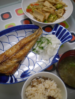 ほっけの塩焼き 油がのっててウマー 生揚げとキャベツのタレ炒め 味噌ダレを作るのが面倒だったんで、 焼肉のタレで炒めました。 甘辛で似たような味になってると思われ。 あおさのりと水菜の味噌汁 カッパ寿司かなんかで買ってきたあおさのり。 超早でできる味噌汁だから、楽チン。 |